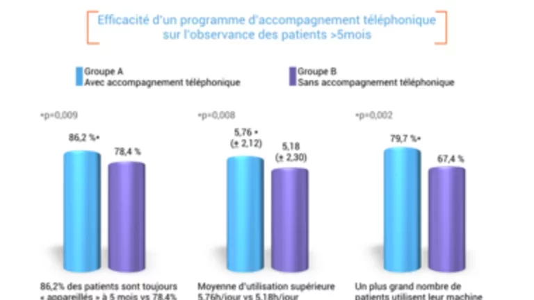 Une étude randomisée (1) a évalué l’efficacité d’un programme d’accompagnement téléphonique personnalisé en début de traitement par PPC sur l’adhésion et l’observance des patients à 5 mois. Les résultats ont démontré le bénéfice de l’accompagnement à travers les trois critères étudiés : le maintien de la PPC à 5 mois, le temps moyen d’utilisation de l’appareil chez les patients toujours "appareillés" et l’évolution des connaissances des patients, des bénéfices perçus et de la vigilance au cours du premier mois de traitement.